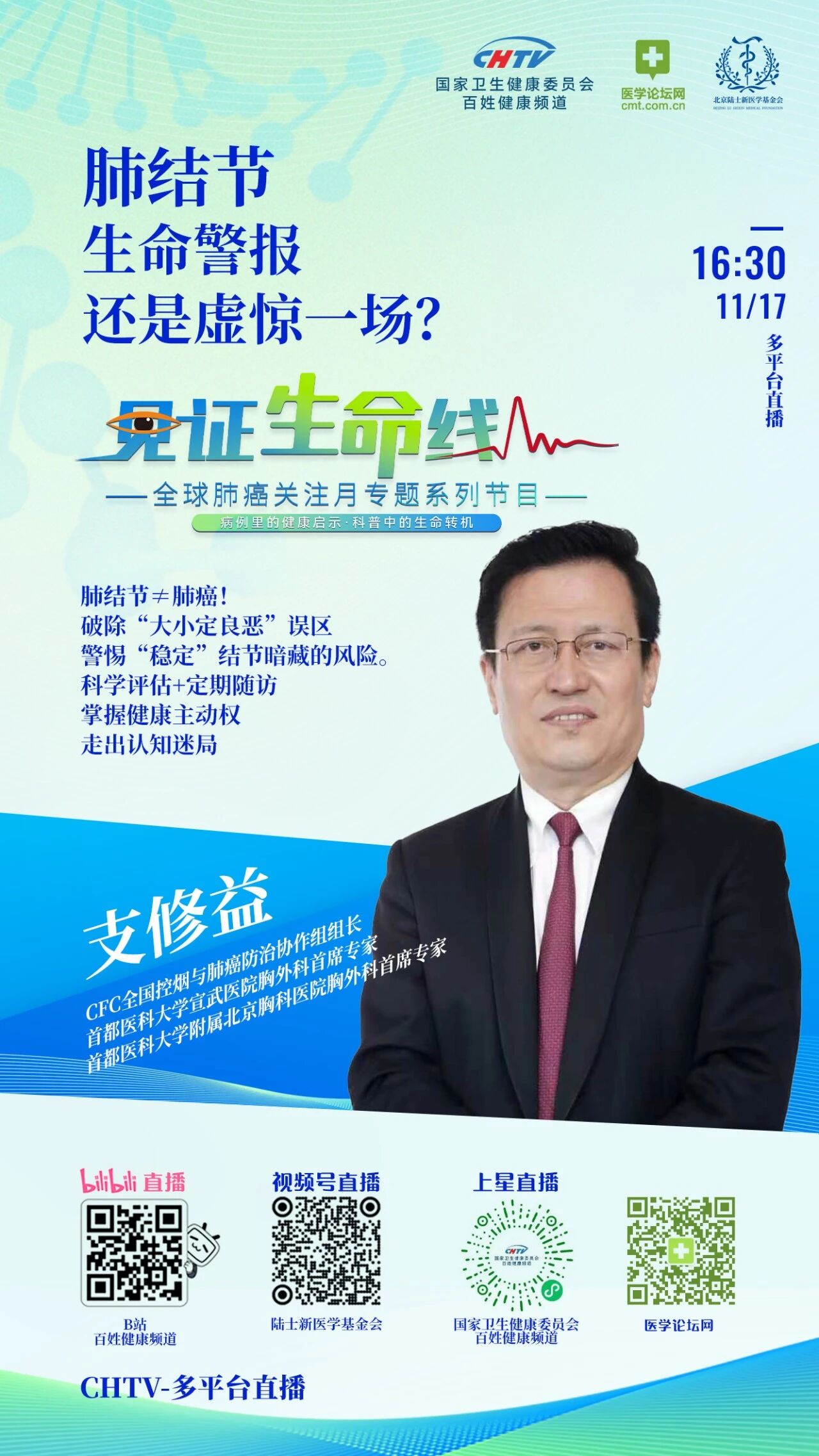 本期《见证生命线》,我们邀请到全国控烟与肺癌防治协作组组长,首都医科大学宣武医院胸外科首席专家,首都医科大学附属北京胸科医院胸外科首席专家支修益教授,用真实的临床病例,为您拨开迷雾,带来一堂关乎健康的必修课。
