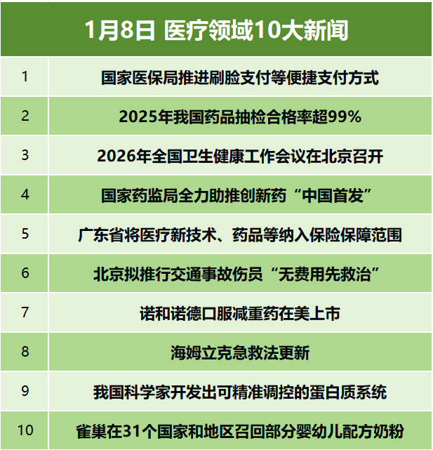 1月8日,国家医疗保障局印发《国家医疗保障局办公室关于大力推进刷脸支付、一码支付、移动支付、信用支付等便捷支付工作的通知》,推进刷脸、一码、移动、信用四种支付落地,覆盖门急诊及住院场景,2026年各省至少2城首批见效,2027年省内统筹地区全覆盖,2028年符合条件定点医疗机构推开,力争三年建成安全高效体系,切实解决群众缴费堵点。