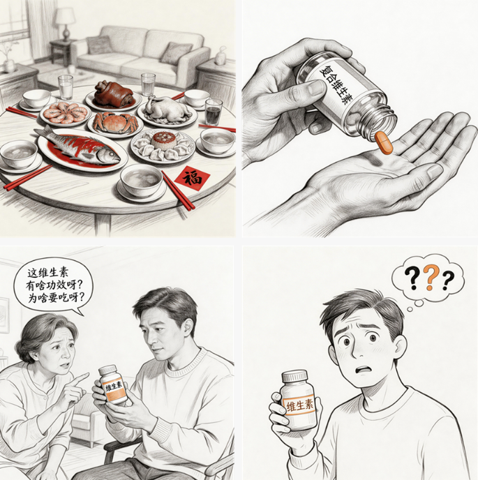 餐桌上摆满了鸡鸭鱼肉,电视里重播着春晚,亲戚们聊着家长里短。你顺手拧开那瓶复合维生素,倒出一粒吞下——这个动作太熟悉了,熟悉到几乎不用过脑子。