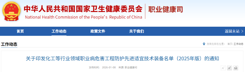 1月8日,国家卫生健康委员会与工业和信息化部联合印发通知,公布化工等行业职业病危害工程防护先进适宜技术装备名单(2025年版)。