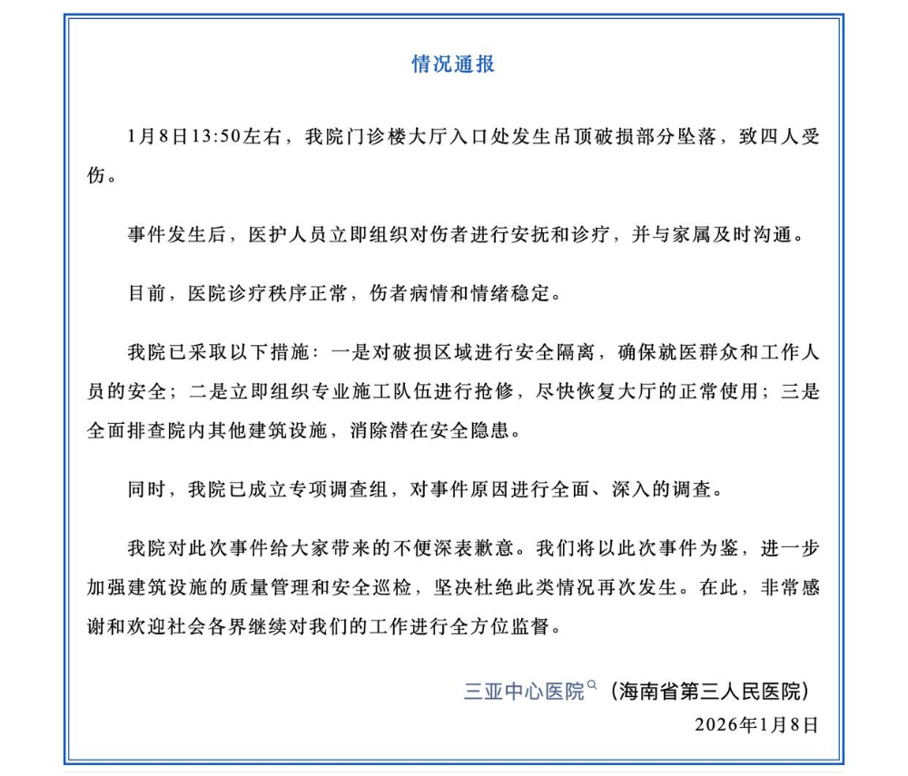 1月8日下午,有网友发布视频称,海南省三亚市一家医院急诊门口,顶部脱落砸到了人。据当地应急部门消息,有1人被砸骨折,正在住院治疗。1月8日深夜,三亚中心医院(海南省第三人民医院)发布情况通报,已成立专项调查组,对事件原因进行全面、深入的调查。(来源:央广网)
