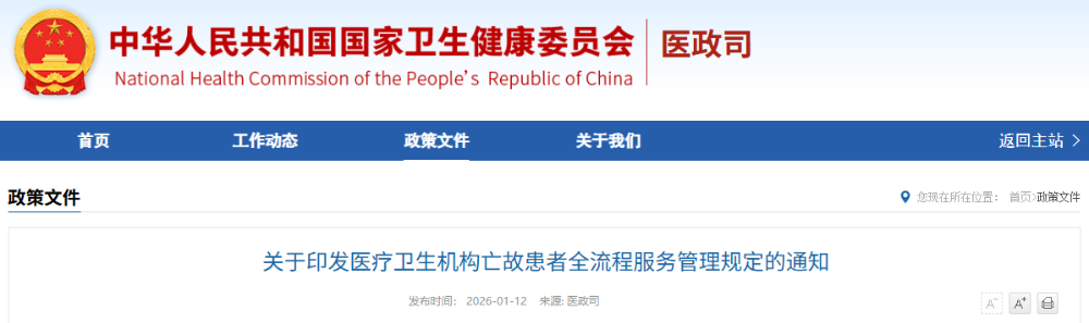 六部门联合印发《医疗卫生机构亡故患者全流程服务管理规定》