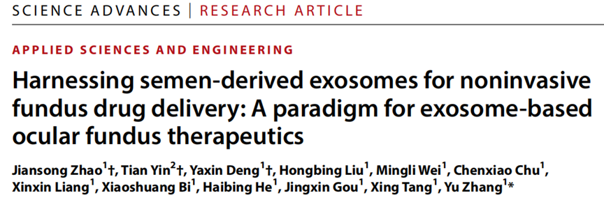 [1]Zhao J, Yin T, Deng Y, et al. Harnessing semen-derived exosomes for noninvasive fundus drug delivery: A paradigm for exosome-based ocular fundus therapeutics[J]. Sci Adv, 2026; 12(13): eadw7275. DOI: 10.1126/sciadv.adw7275.