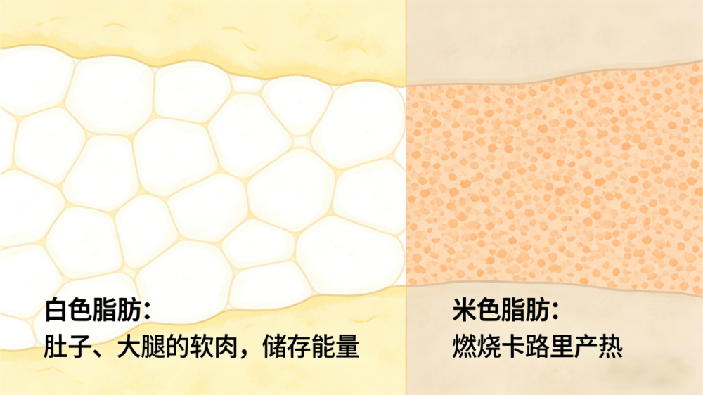 白色脂肪就是你肚子上、大腿上那圈软肉,专门储存能量,像身体的“粮仓”;米色脂肪可以比作燃烧卡路里产热的“耗能狂魔”,像身体的“壁炉”。